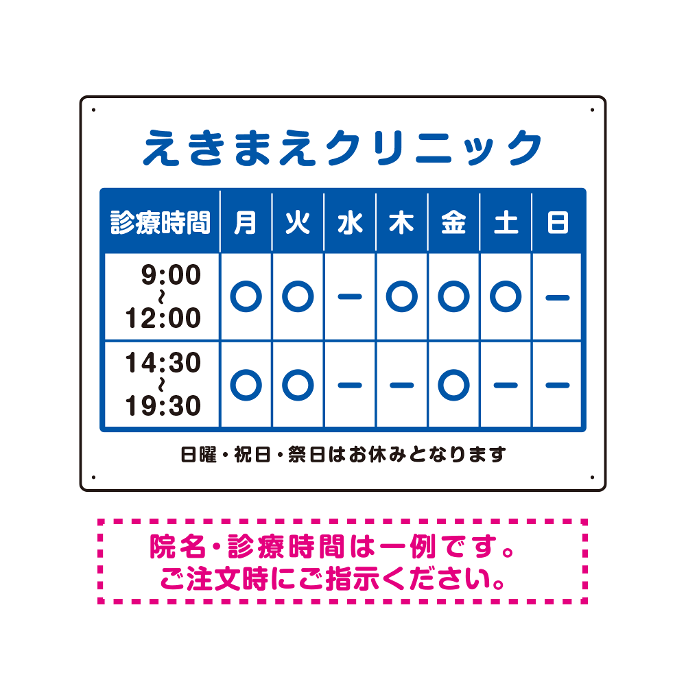 - クリニック名付き診療時間案内 カラー文字・枠デザイン 病院・クリニック向けプレート看板 ブルー W600×H450 アルミ複合板