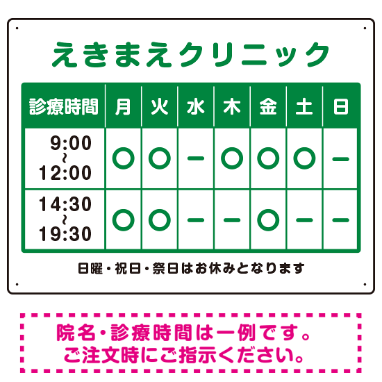 クリニック名付き診療時間案内 カラー文字・枠デザイン 病院・クリニック向けプレート看板 グリーン W600×H450 アルミ複合板