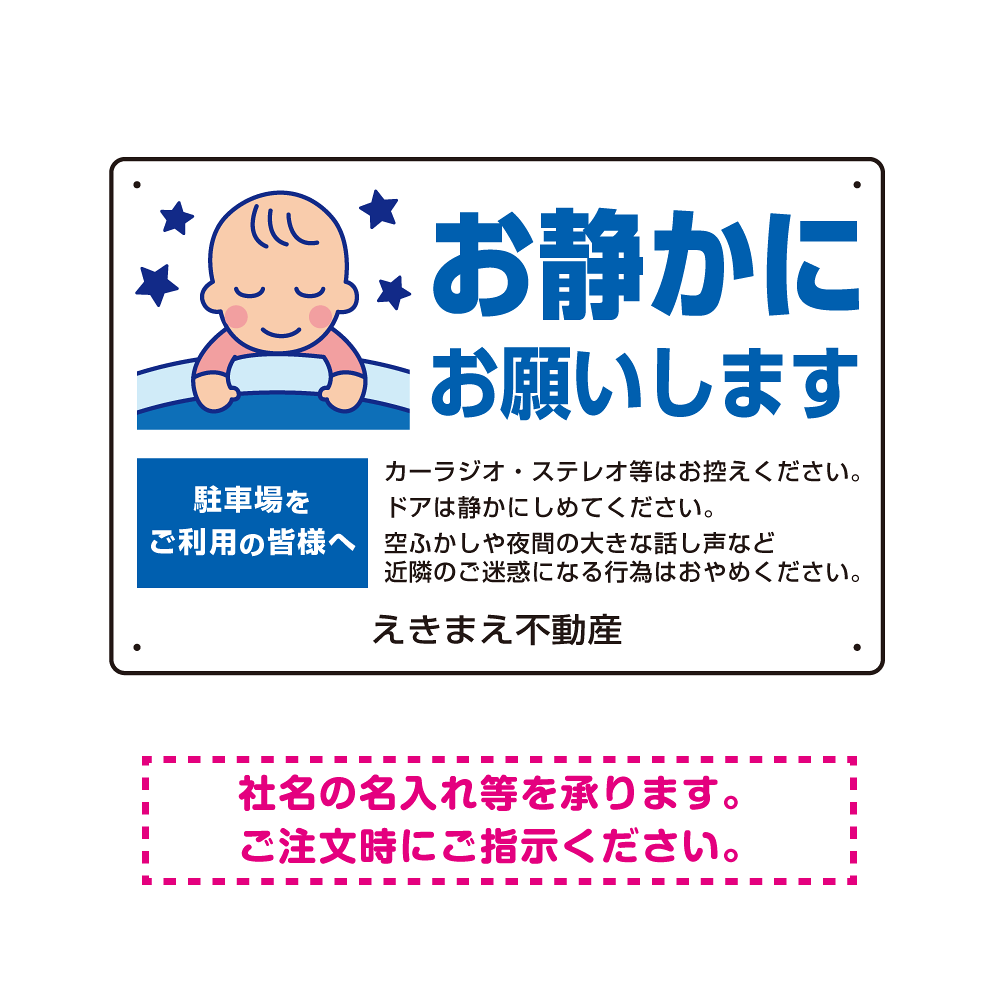 商品説明:静かにお願いします 駐車場 オリジナル プレート看板 W450×H300 エコユニボード