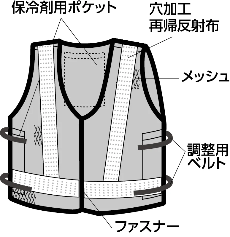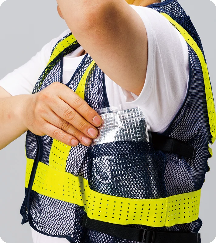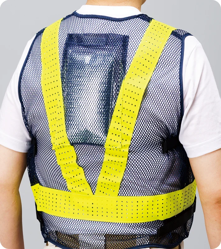 螢光&反射で昼夜問わずに安心&クール!保冷剤は作業の邪魔になりにくい背中と両脇に装備