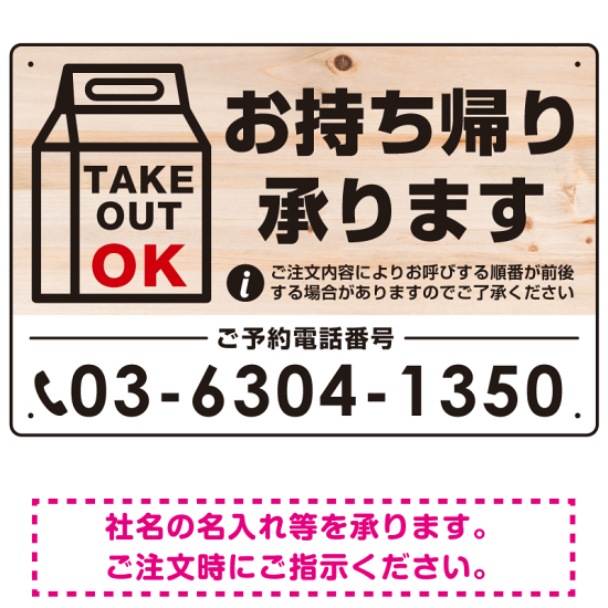 木目調に紙袋風のデザインが映えるデザイン。電話番号をお入れして製作いたします。