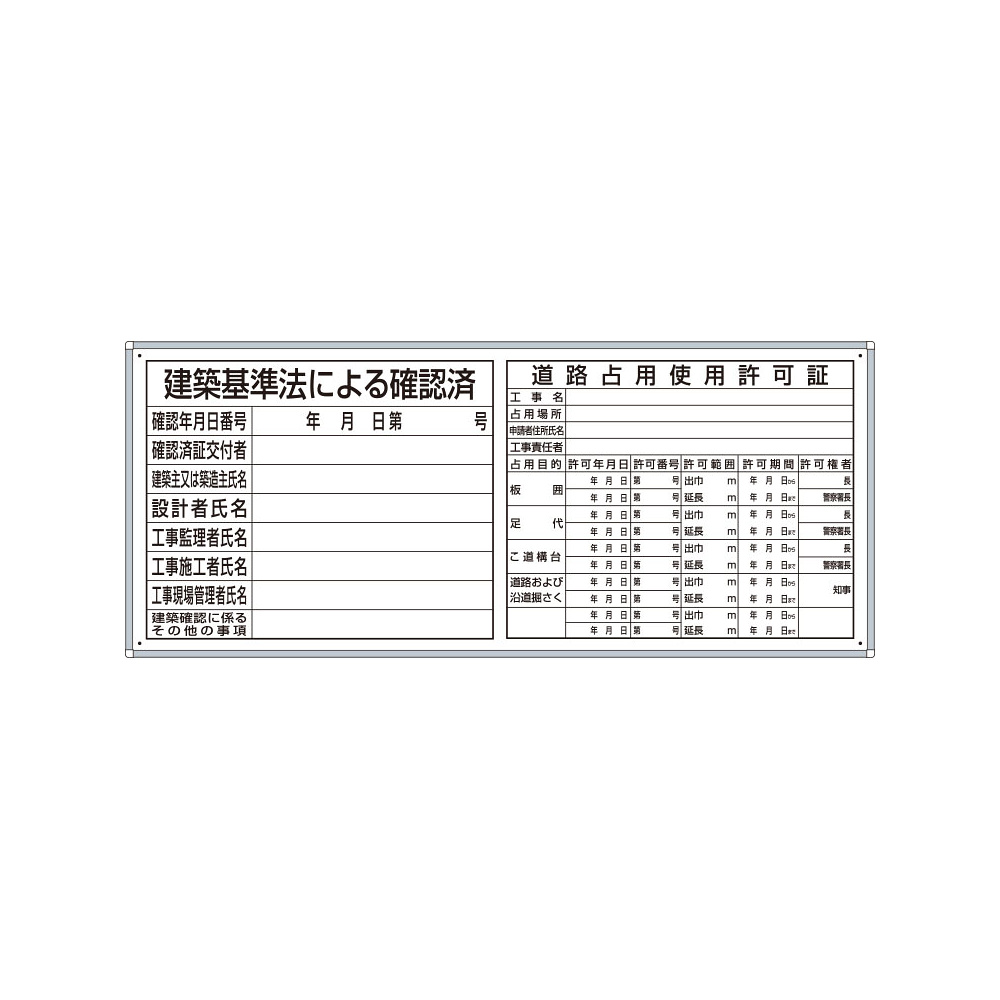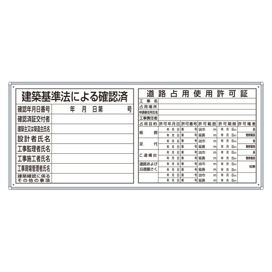 商品説明:薄型許可票2点表示入パネル 表示:建築基準法による確認済・道路占用使用許可証 小 (302-61A)