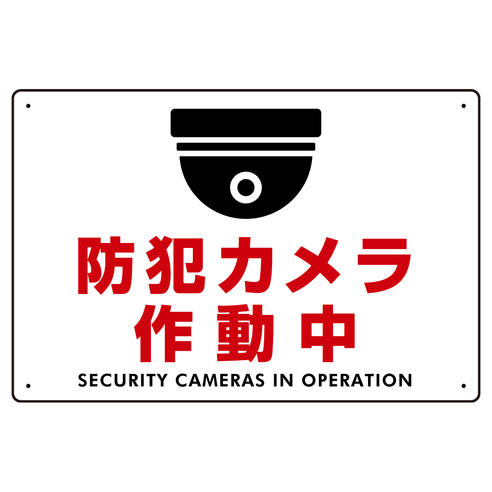 商品説明:防犯カメラ作動中 (丸形イラスト) 白地/赤文字 オリジナル プレート看板 W450×H300 エコユニボード