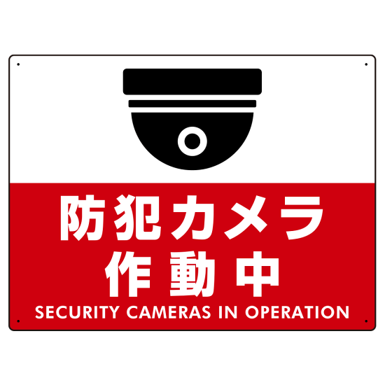 防犯カメラ作動中 (丸形イラスト) 赤地/白文字 オリジナル プレート看板 W600×H450 エコユニボード