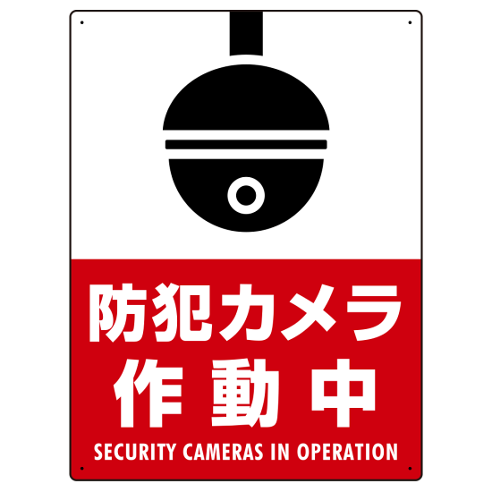 防犯カメラ作動中 (丸形イラスト) タテ型 赤地/白文字 オリジナル プレート看板 W600×H450 エコユニボード