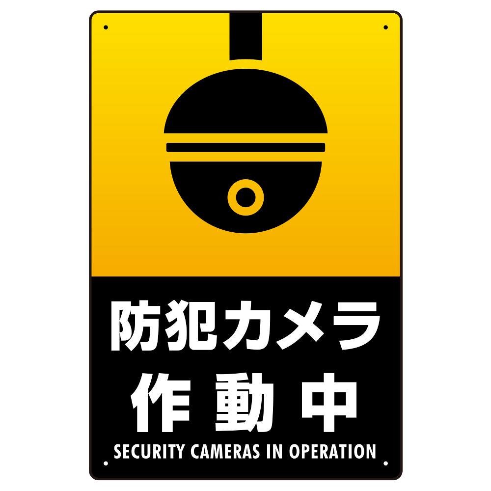丸形タイプの防犯カメライラスト付き警告プレート。店内の防犯対策に。