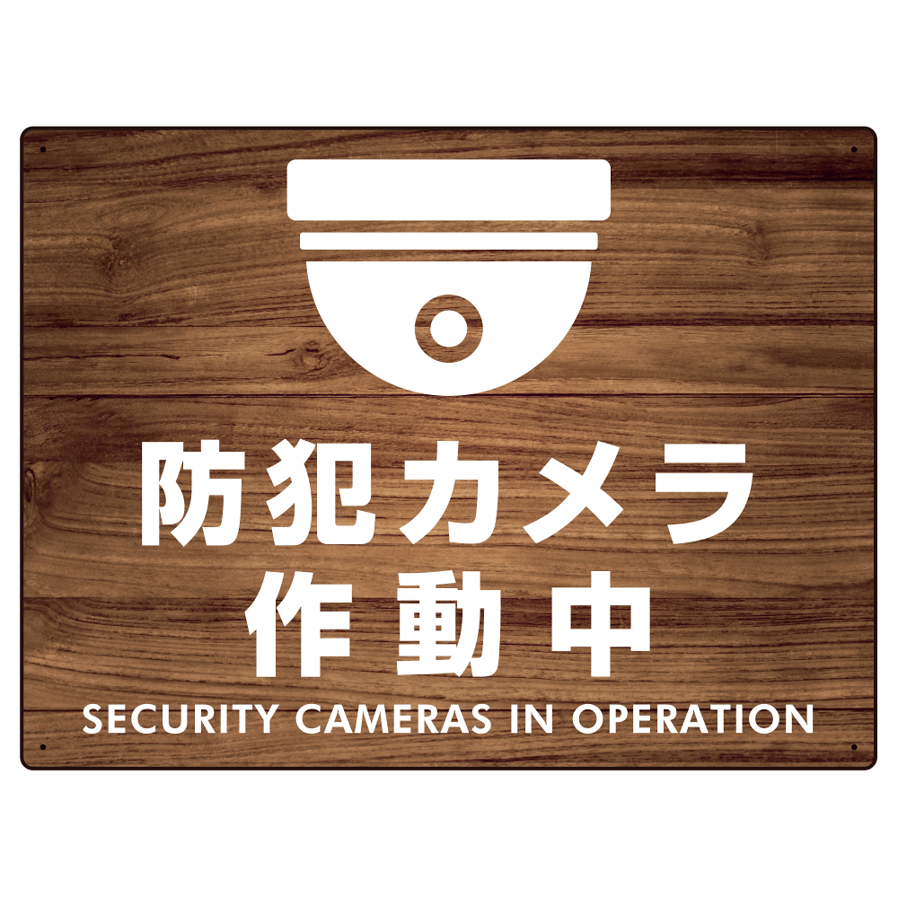 - 木目調(ケヤキ調)の防犯カメラ実施中プレート看板。デザイン重視のロケーションに最適です。