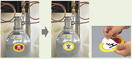保管情報と空充表示を一緒に管理しやすい、ボンベ用ステッカー。