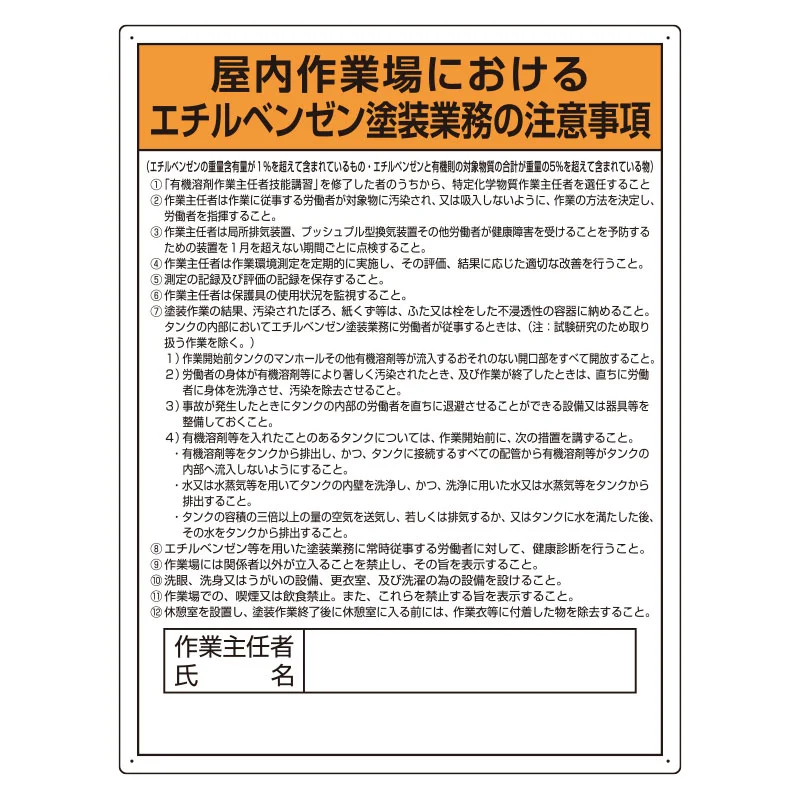 エチルベンゼン塗装業務の注意事項を、現場で分かりやすく掲示できる管理標識。