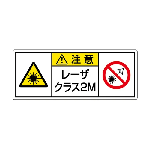 レーザクラス2Mの注意表示を、禁止図記号付きで分かりやすく伝えるステッカー。