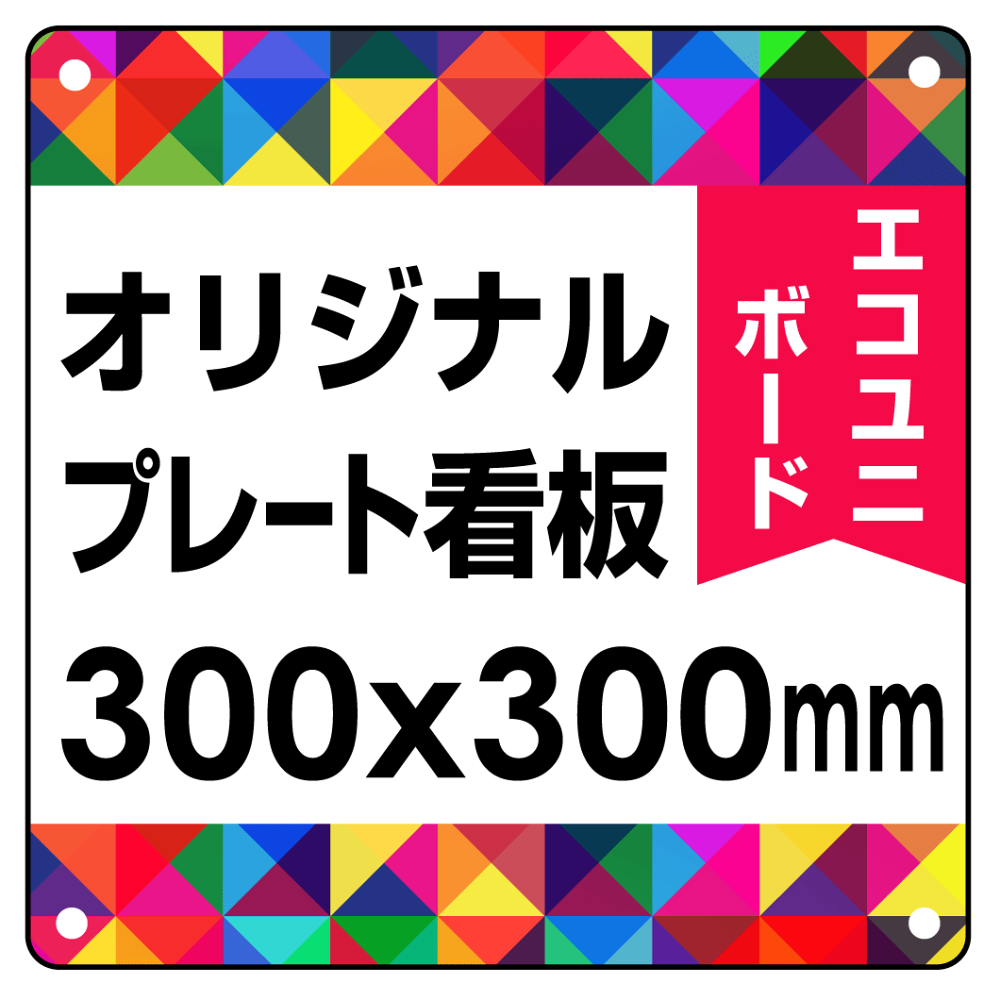 商品説明: オリジナルプレート看板 (印刷費込) 300×300 エコユニボード (角R・穴4)