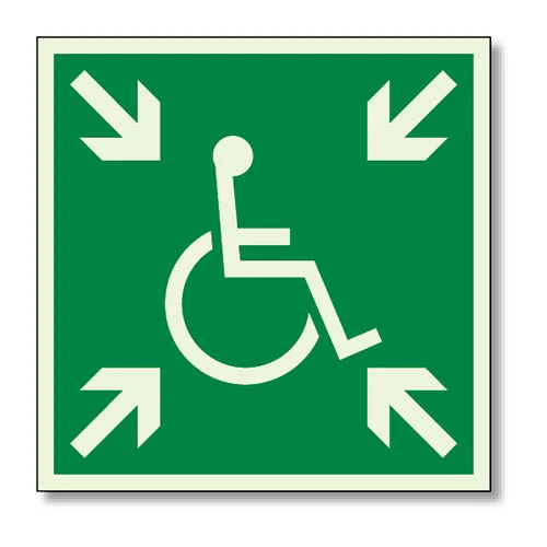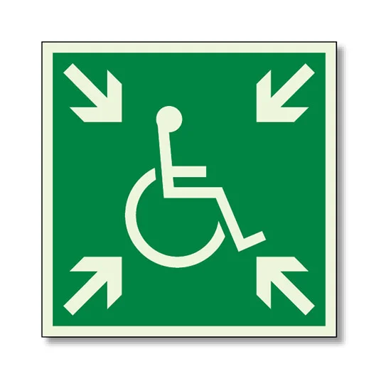 歩行困難者が待機できる場所を分かりやすく示す、一時避難エリア用標識。
