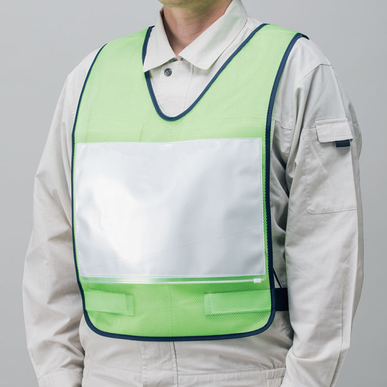 両面に付いたポケットにA4用紙を差し込んで表示できるベスト。