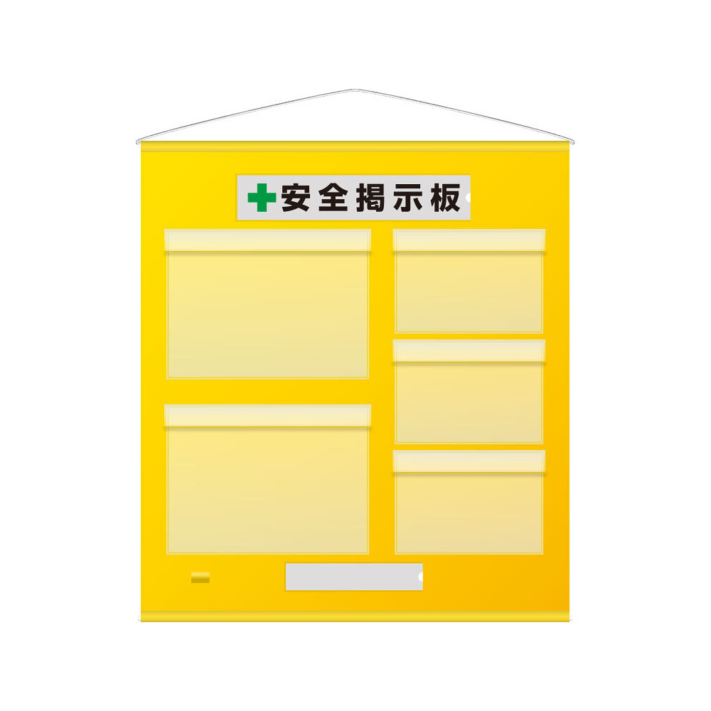 - 吊り下げヒモ、上部タイトル板、下部社名入れ用白無地紙