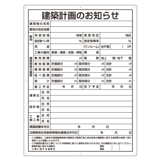 商品説明:建築計画のお知らせ エコユニボード 川崎市型 (302-21KW)