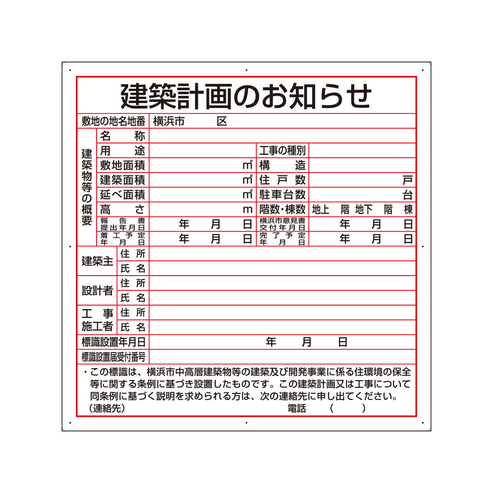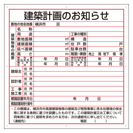 商品説明:建築計画のお知らせ アルミ複合板製 横浜市型 (302-26Y)