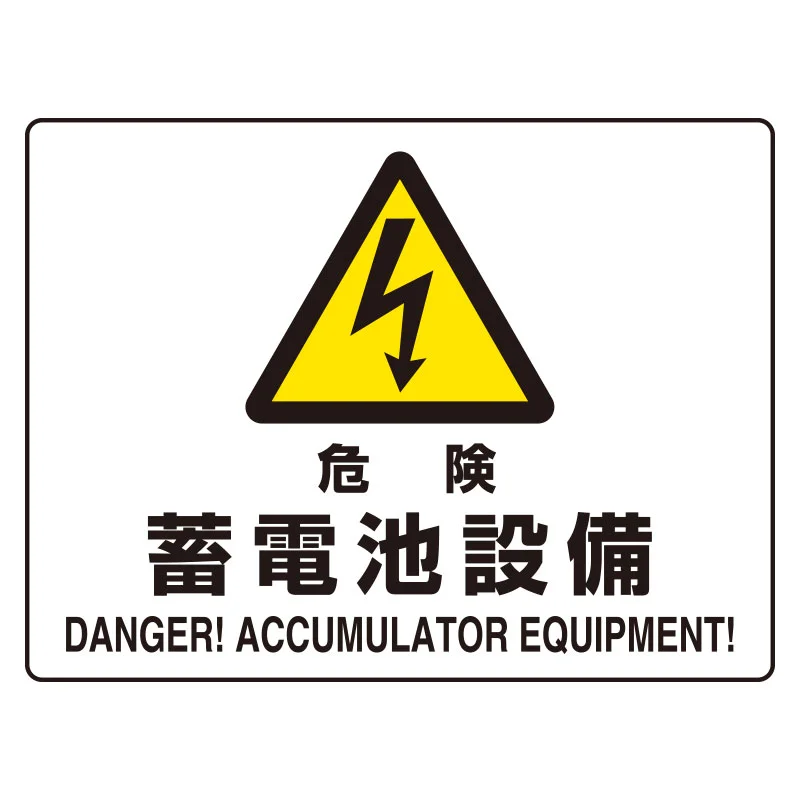 - 警告マークと「蓄電池設備」の表示で直感的に認識しやすく、蓄電池室や電源設備周辺の危険表示として役立ちます。