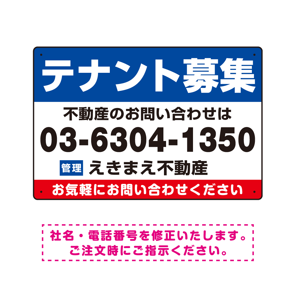 テナント募集 ブルー・電話番号大きめ デザインB オリジナル プレート看板 W450×H300 アルミ複合板