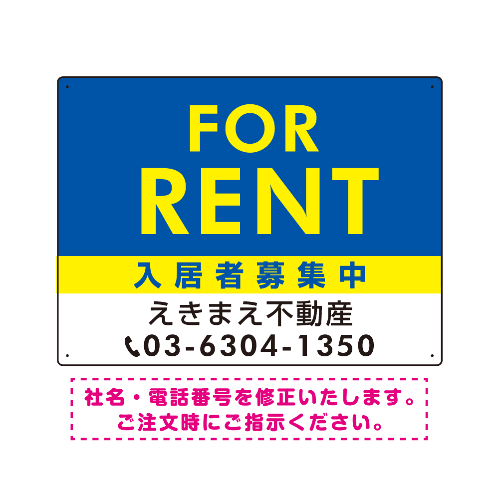 商品説明:FOR RENT 入居者募集中 ブルー・イエロー デザインC オリジナル プレート看板 W600×H450 アルミ複合板