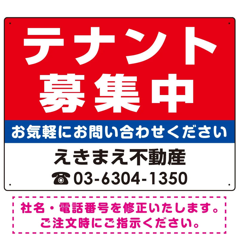 よくある質問:テナント募集中 赤地・白文字 デザインA オリジナル プレート看板 W600×H450 エコユニボード