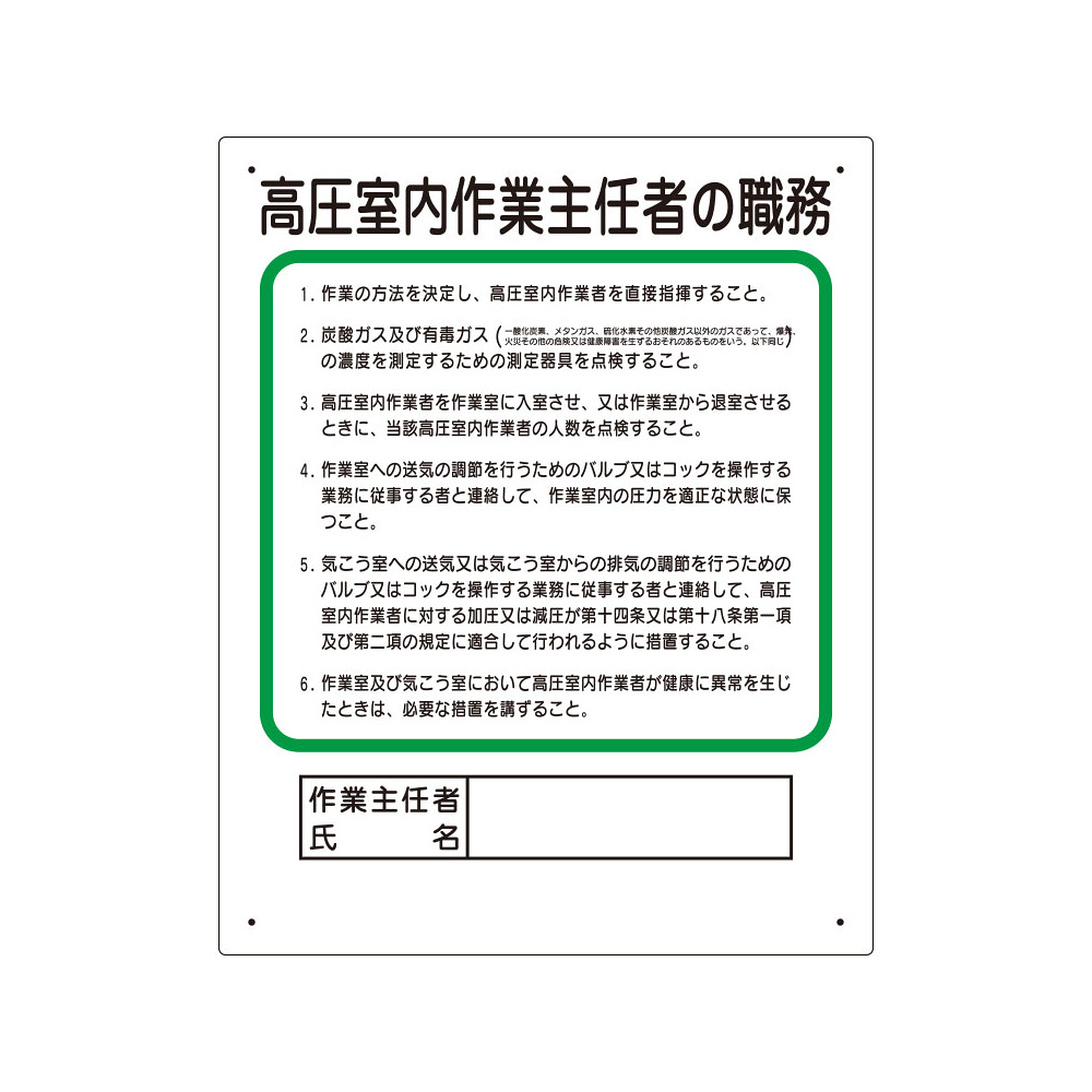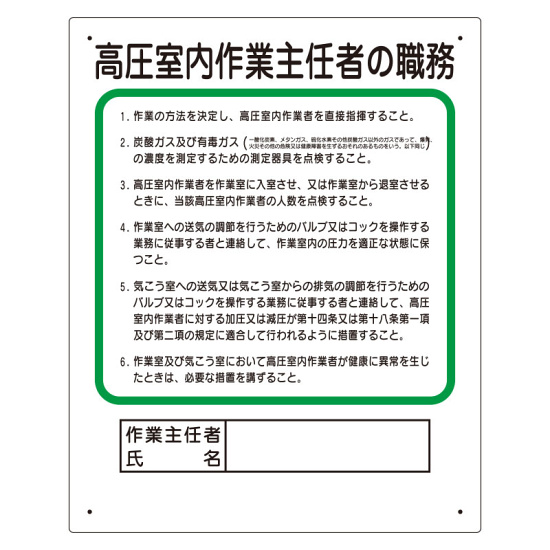 商品説明:作業主任者職務表示板 高圧室内作業主任者の職務 (356-19A)