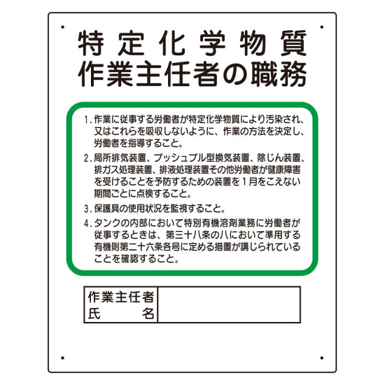 商品説明:作業主任者職務表示板 特定化学物質作業主任者の職務 (356-17B)