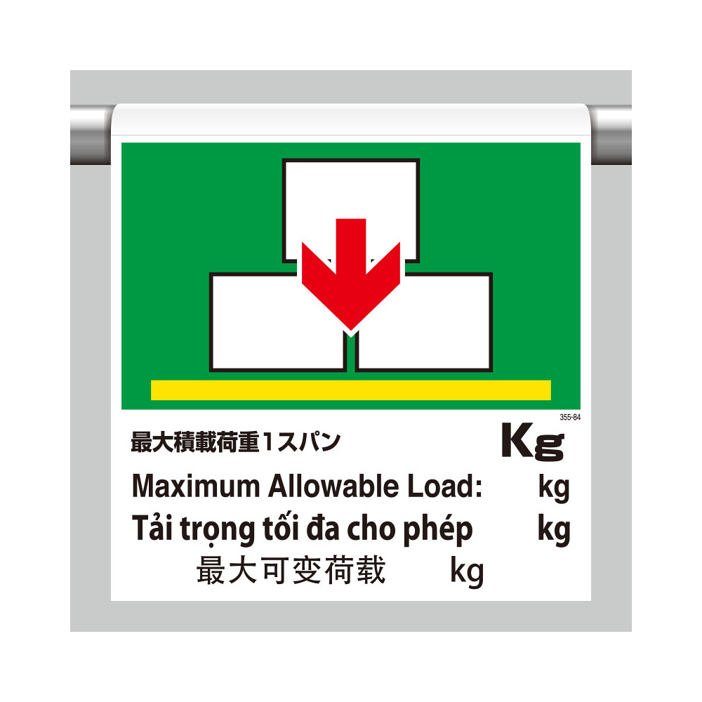 商品説明:ワンタッチ取付標識(4カ国語) 最大積載荷重1スパン○kg (355-84)