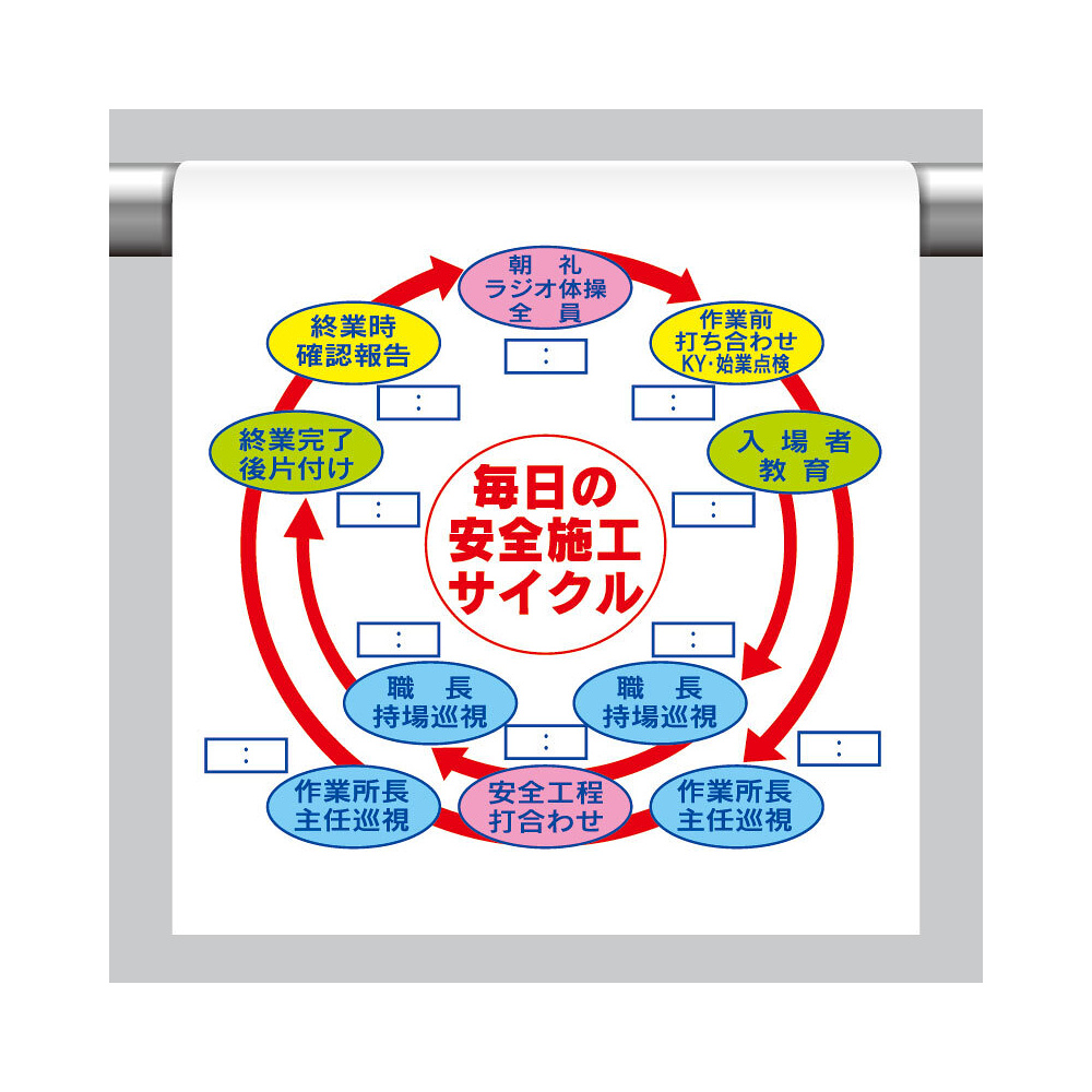 商品説明:ワンタッチ取付標識(イラスト) 毎日の安全施工サイクル (340-125)