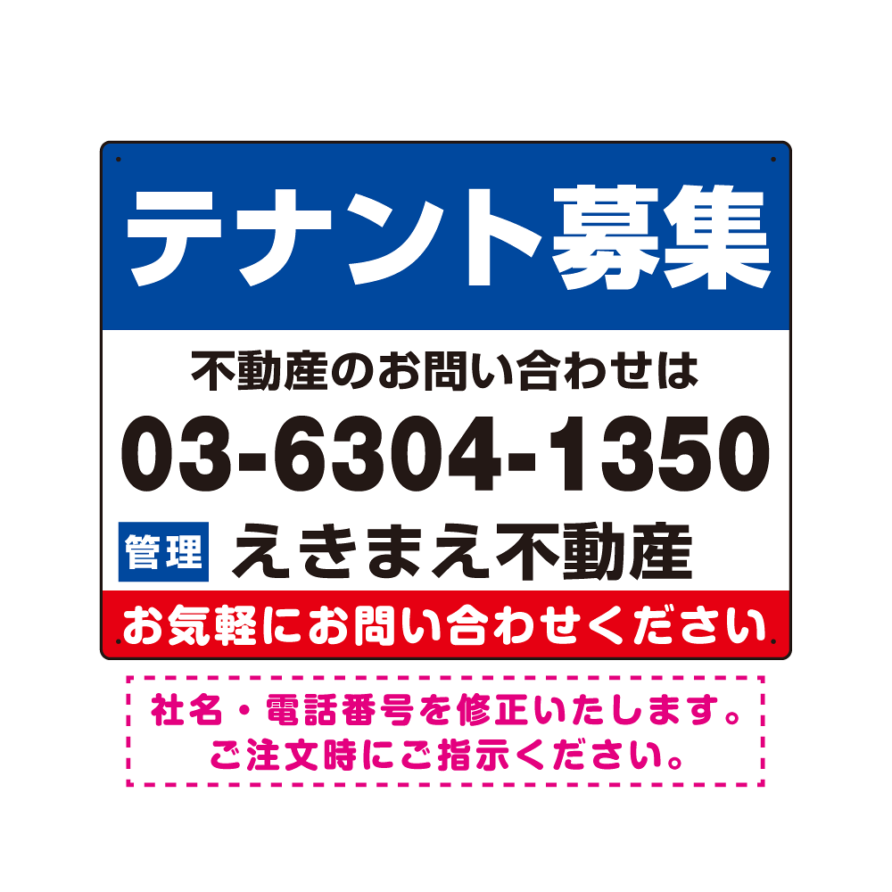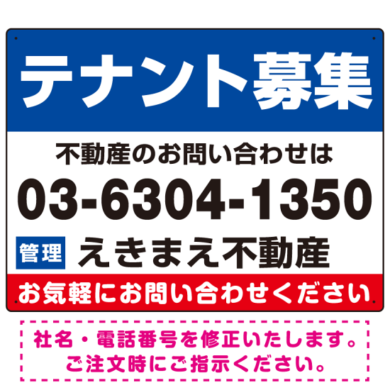テナント募集 ブルー・電話番号大きめ デザインB オリジナル プレート看板 W600×H450 エコユニボード