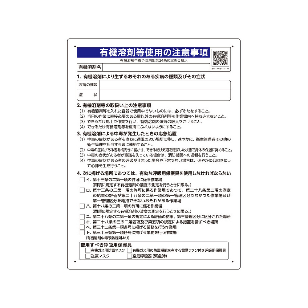 商品説明:有機溶剤標識 有機溶剤等使用の注意事項 600×450×1mm厚 エコユニボード(穴4スミ) (390-01)
