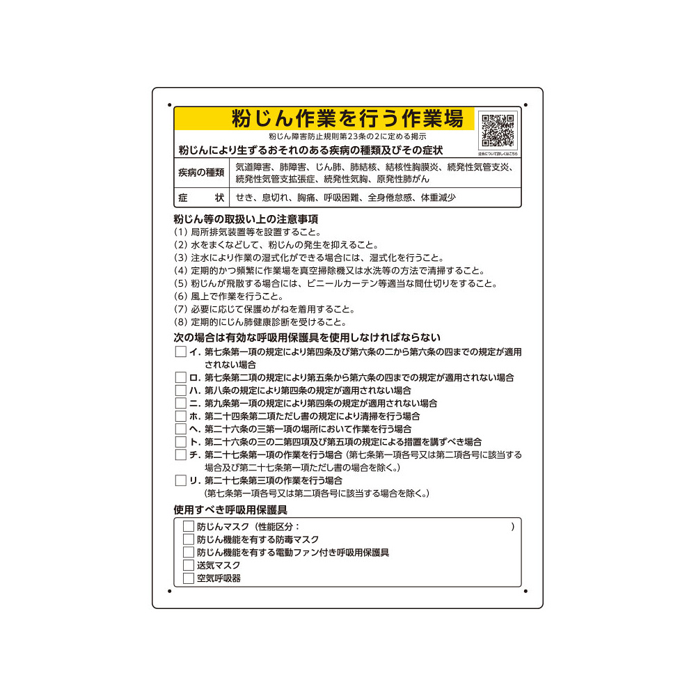商品説明:粉じん障害防止標識 粉じん作業を行う作業場の注意事項 600×450×1mm厚 エコユニボード(穴4スミ) (309-20)