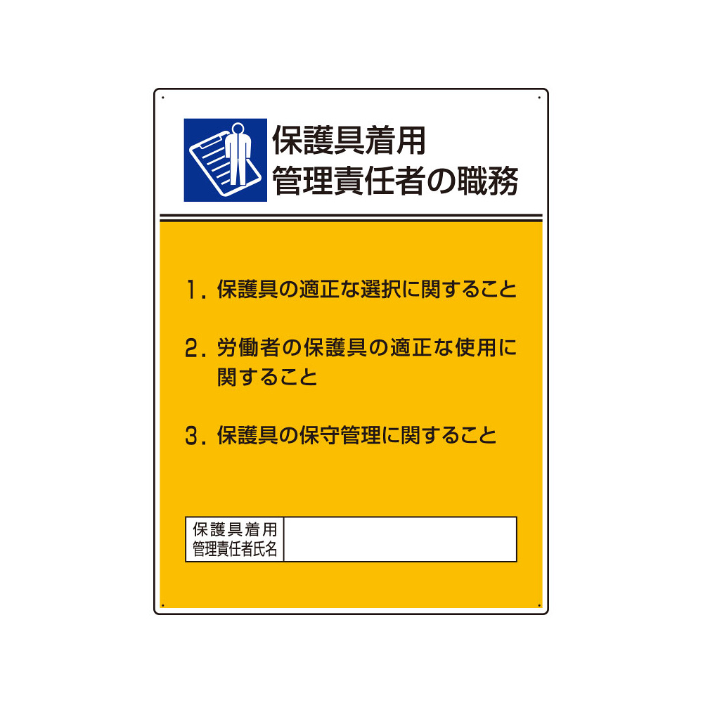 商品説明:保護具着用管理責任者の職務標識 600×450 エコユニボード(穴4スミ)