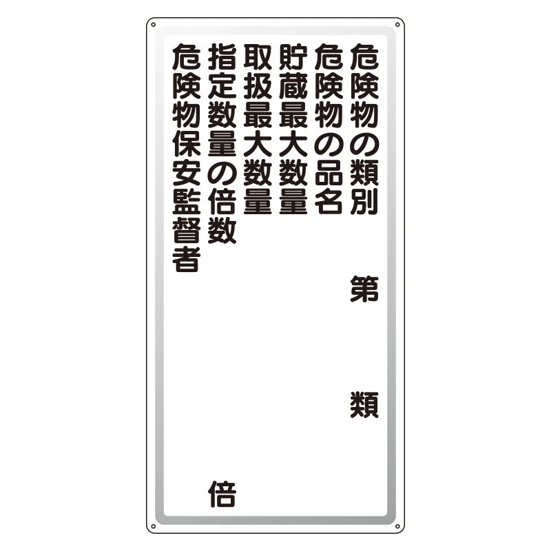- 危険物の類別・品名・最大数量・指定数量の倍数・取扱責任者などを記入して使いたい場所に適した標識です。