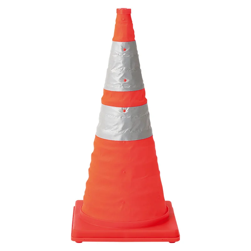 折りたたんで持ち運びやすく、夜間の視認性も高めやすい伸縮式コーン。