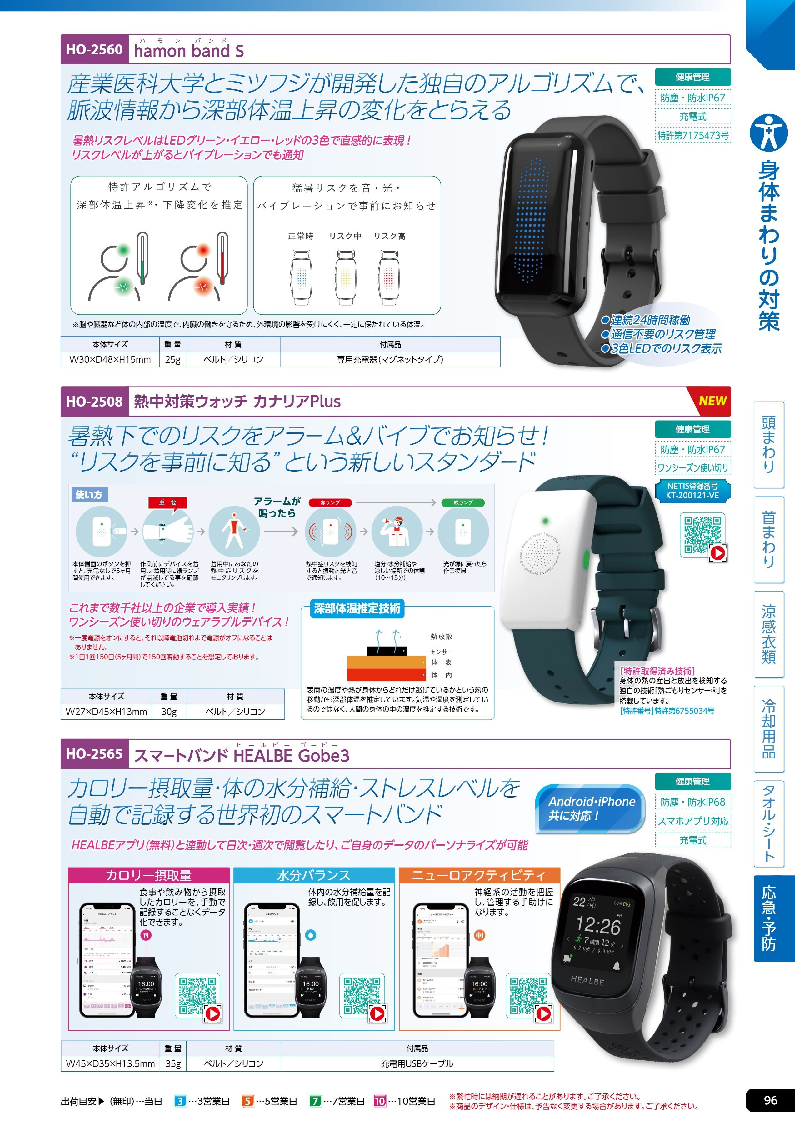 スマートバンドHEALBE Gobe3 (HO-2565)は、ユニット 熱中症対策用品カタログ 2026年版(166R) P.96に掲載されています