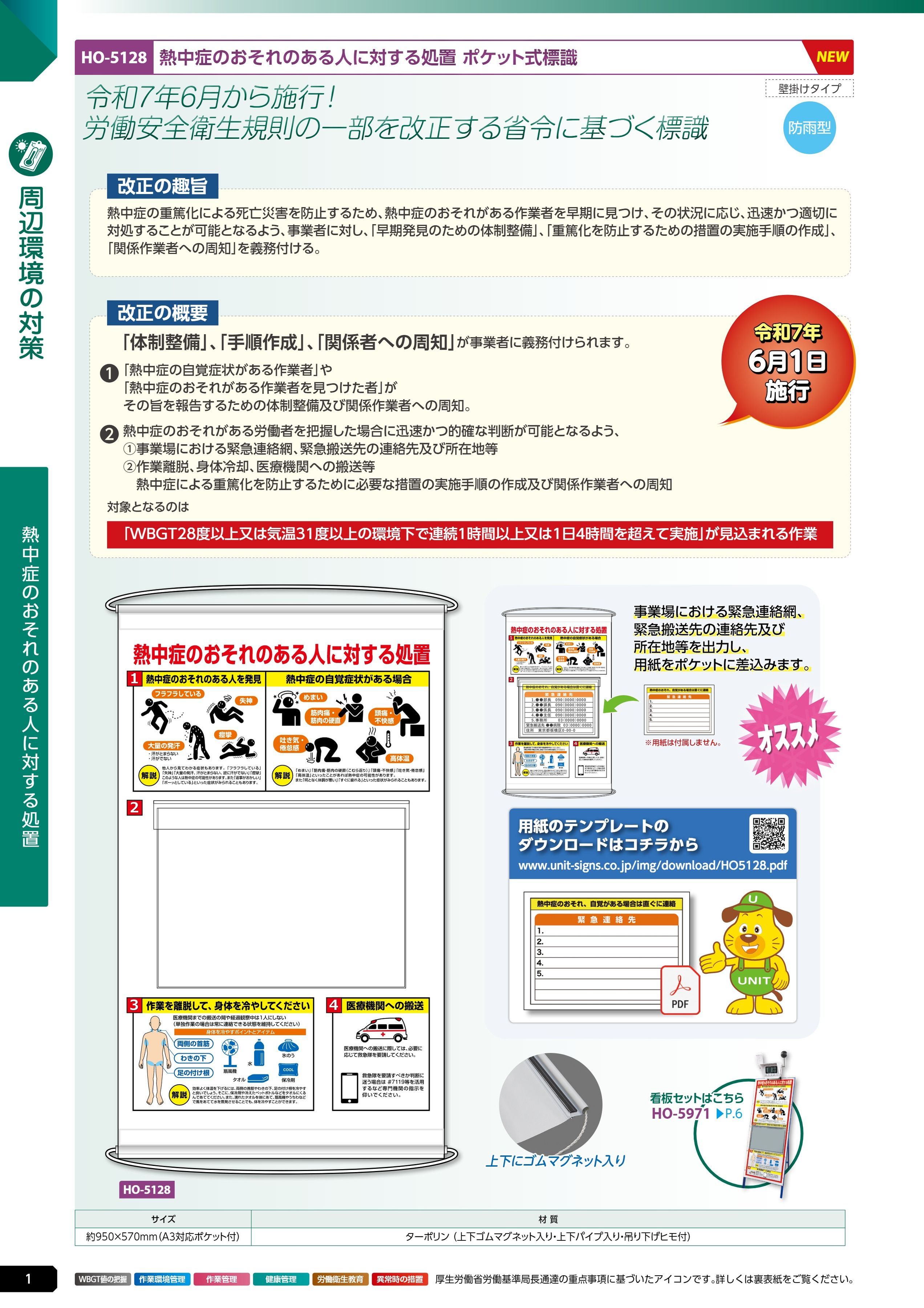 熱中症のおそれのある人ポケット式標識 (HO-5128)は、ユニット 熱中症対策用品カタログ 2026年版(166R) P.1に掲載されています