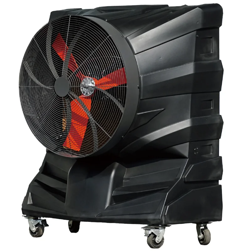 - ブレード径100cmの大型冷風機「雷神」。最大風速9.4m・空気流量27,700m³/h