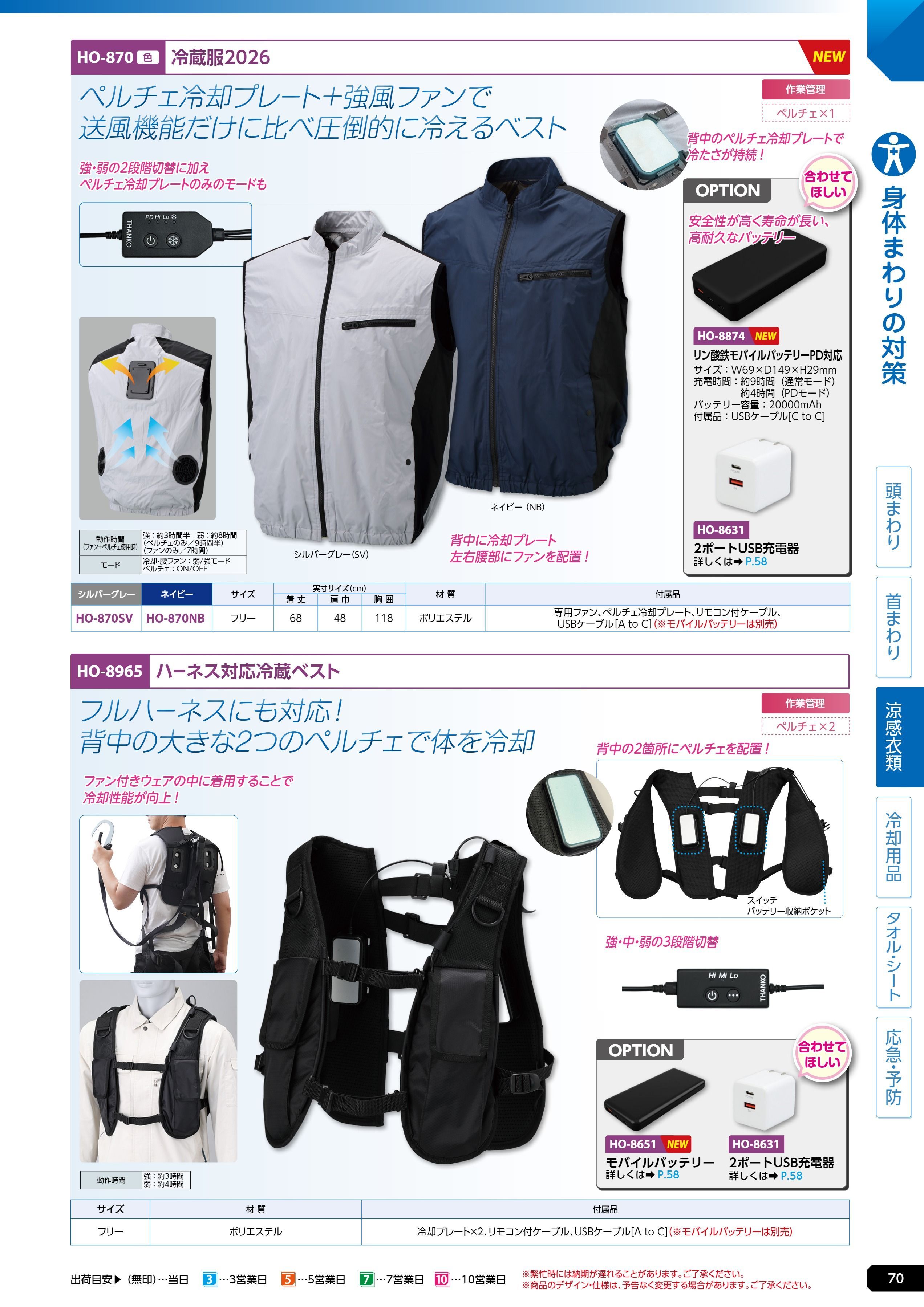 ハーネス対応冷蔵ベスト (HO-8965)は、ユニット 熱中症対策用品カタログ 2026年版(166R) P.70に掲載されています