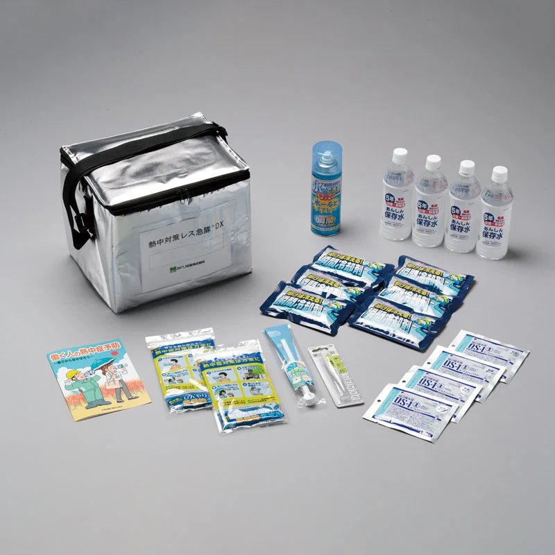 - 内容品①クーラーバッグ×1、②叩けば冷える瞬間冷却材×6、③氷ーるどスプレー420ml×1、④あんしん保存水500ml×4、⑤経口補水液OS-1パウダー500mL用×4、⑥ひんやり多目的タオル×2、⑦冊子「働く人の熱中症予防」×1、⑧電子体温計×1、⑨防滴扇子×1