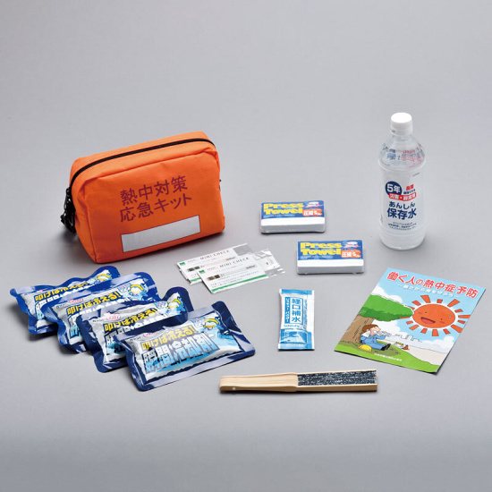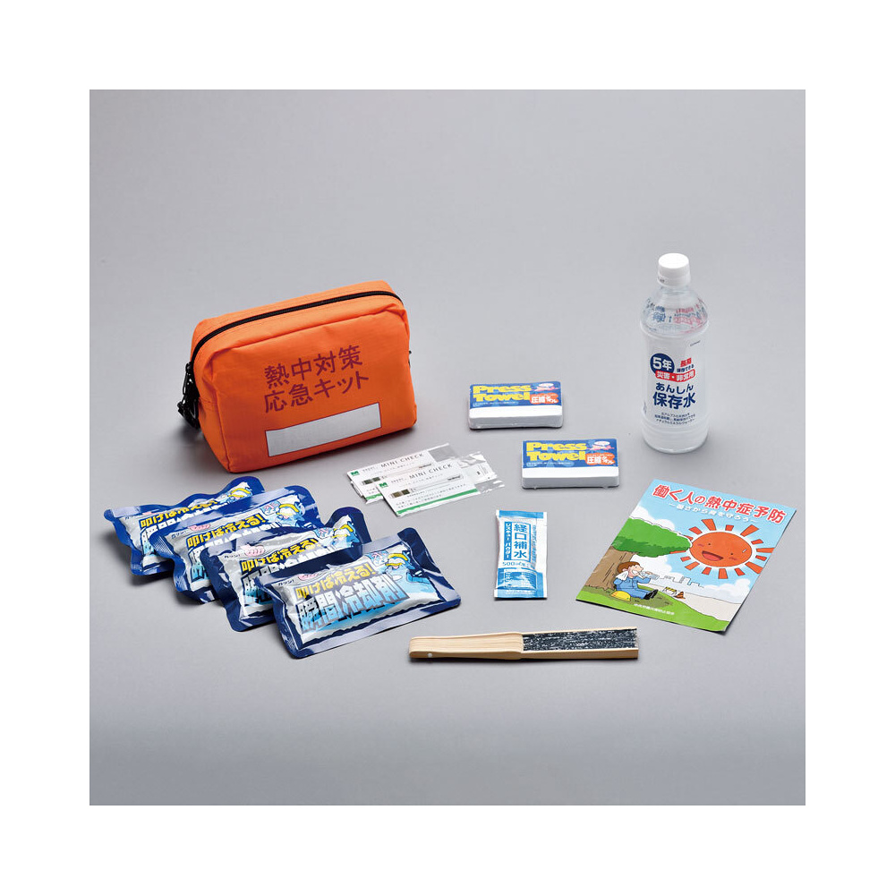 - ①収納バッグ1②安心保存水500㎖1③経口補水 レスキューパウダー1④叩けば冷える瞬間冷却剤4⑤圧縮タオル2⑥液晶体温計ミニチェック2⑦扇子1⑧暑さから身を守ろう「働く人の熱中症予防」(中央労働災害防止協会)1