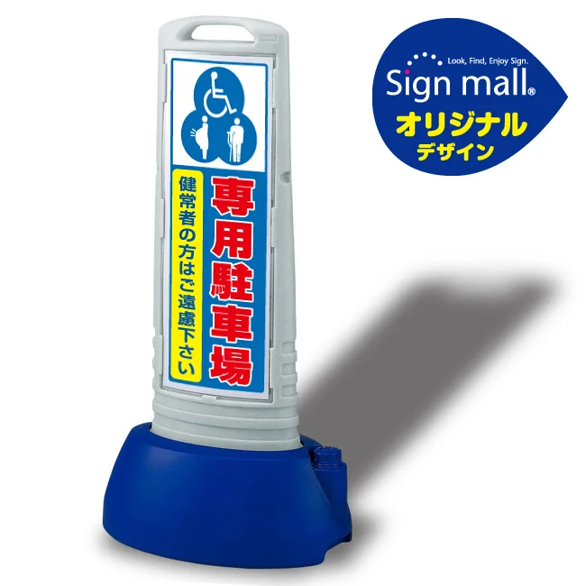 - ●表示内容:車椅子マーク(障害者のための国際シンボルマーク)・妊婦マーク・けが人マークと、「専用駐車場」「健常者の方はご遠慮ください」の文言。