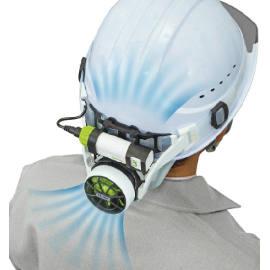 首すじとヘルメット内の2方向に強力送風。日差し・ムレから頭部を解放!