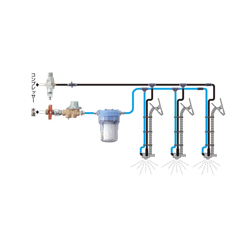 - セット内容/ウレタンチューブ(20m)×2本、フレキシブルアーム(45cm)×3本、エアレギュレーター×1個、ボールバルブ×1個、 配管部材一式、水減圧弁×1個、水フィルター×1個、ワンタッチチーズ×4個、ワンタッチストレート×2個