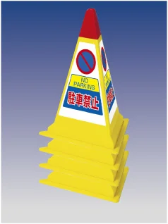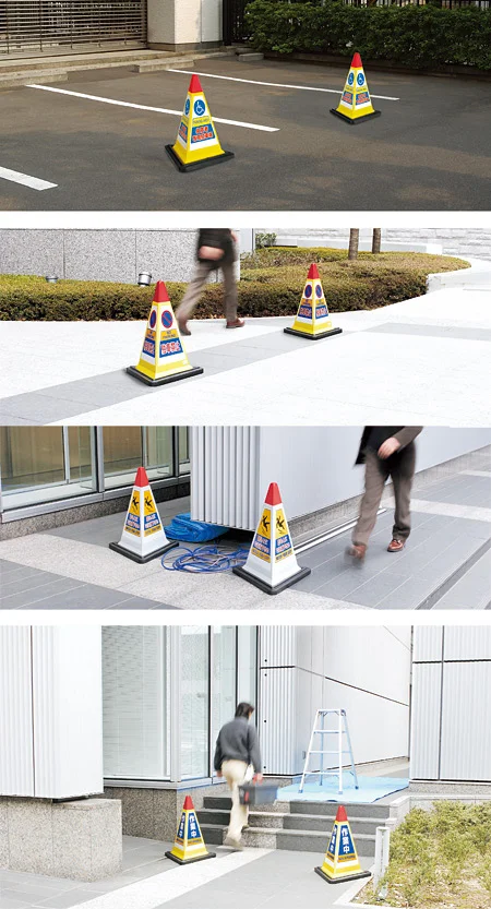 立入禁止をどの方向からでも見やすく伝えられる、3面表示のサインピラミッド。