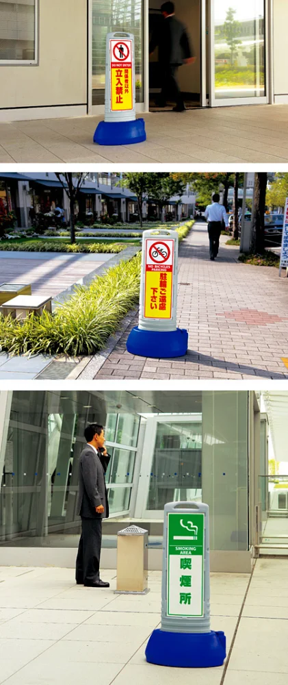 - 注水ウエイトのみ持ち運べるため設置しやすく、片面表示・両面表示と本体色の違いから、現場に合わせた案内や注意表示に役立ちます。