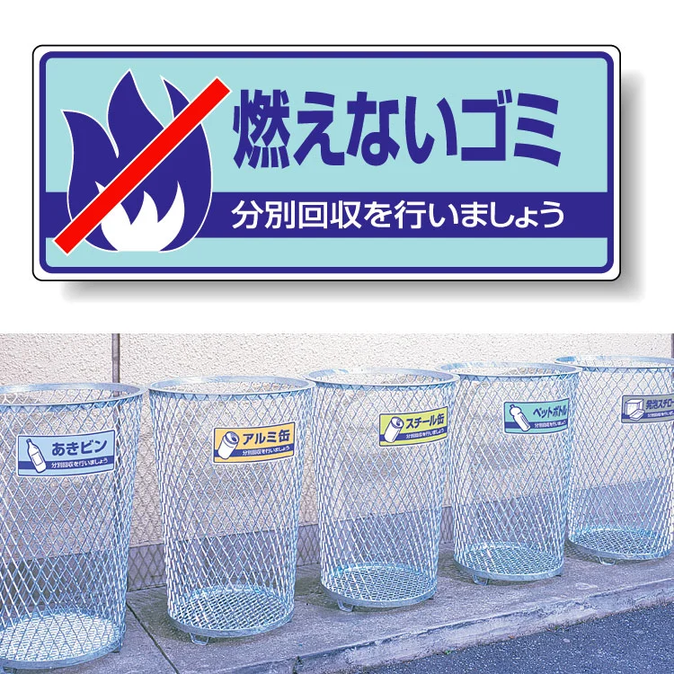 - 燃えないゴミの回収場所や容器を明確に表示したい場面に適した分別標識です。