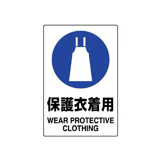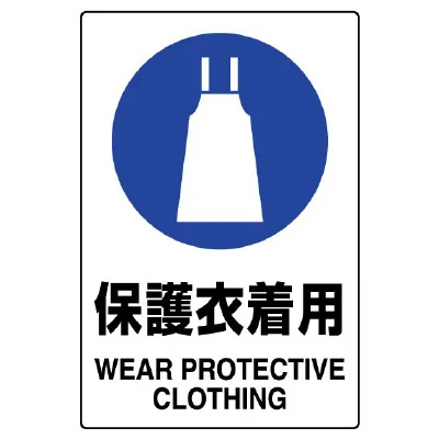 - 青の安全表示と保護衣のピクトグラムで認識しやすく、工場や衛生管理エリアの保護具表示として役立ちます。