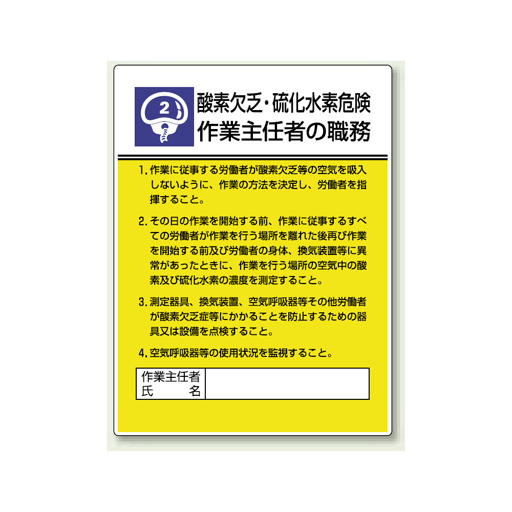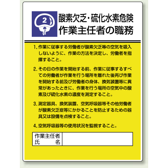 商品説明:酸素欠乏、硫化水素危険 「作業主任者職務表示板」 (808-02)