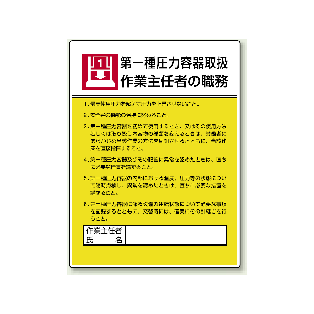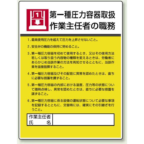 商品説明:第一種圧力容器取扱 「作業主任者職務表示板」 (808-07)