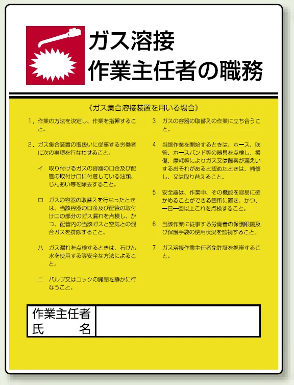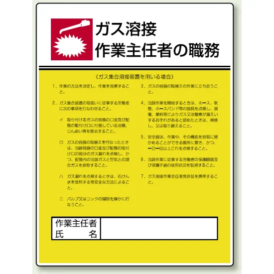 - ガス溶接等に関する作業主任者の職務内容を、現場で明確に掲示したい場面に適した表示板です。